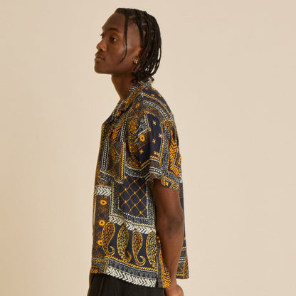 ペイズリー柄がプリントされた、ポプリン素材の半袖シャツ。ボタンフロント