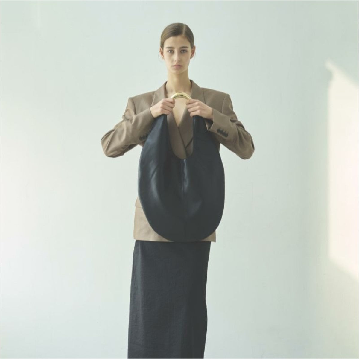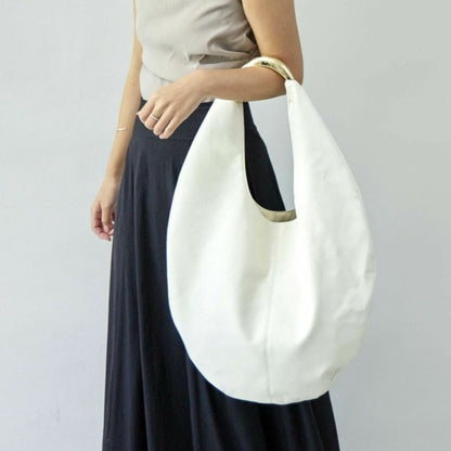 さらっと合わせるだけで様になる、マチのない丸みのあるフォルムが印象的なバッグ。オリジナルのハンドルが、シンプルな中にもディテールへのこだわりを感じさせるアイコニックなアクセントに。
