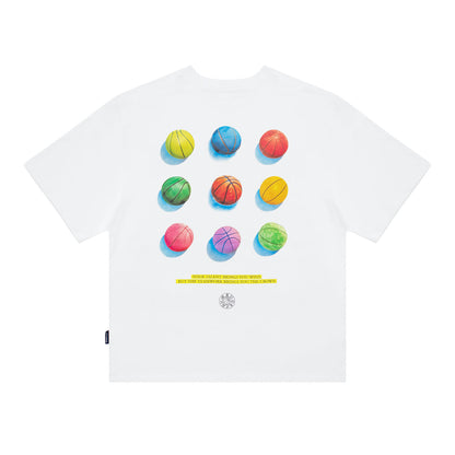 【気分華やぐポップなカラーリング】色とりどりのバスケットボールと子供サイズのスニーカーを温かい手書きタッチで描いたTシャツ。