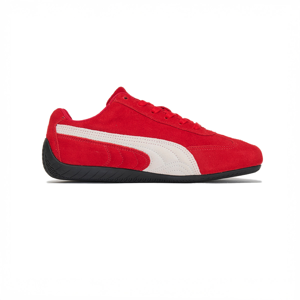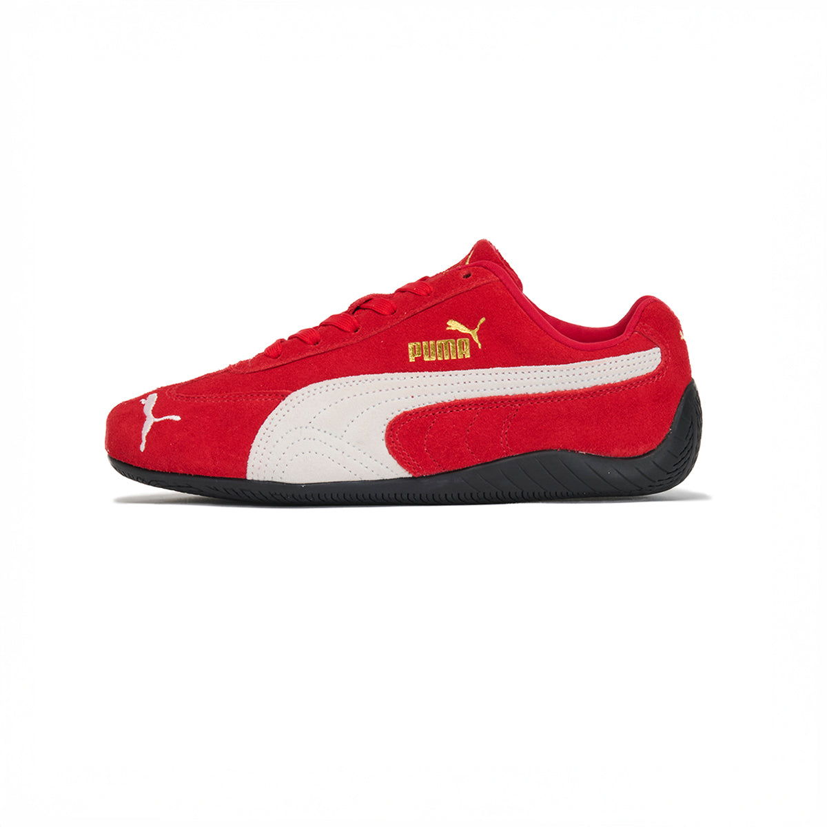 トラックレースのスピードにインスパイアされた、プーマスピードキャットOG。スピードキャットは、1999年に誕生し、80年代から90年代にかけてF1グランプリのドライバーが履いていた耐火レーシングシューズをベースにしたライフスタイルシューズです。レーシングにインスパイアされたなめらかなラインと空気力学に基づいたデザインにより、ファッションやスニーカーカルチャーに衝撃を与えてきました。今回、再びリリースされるスピードキャットOGは、F1レーシングチームを彷彿とさせるブラックとレッドの2色展開で、スウェード素材をふんだんに使用した仕上がりとなっています。2000年代初頭のレーシングウェアに敬意を表し、つま先には“プーマキャット”の刺繍が施され、シュータンとフォームストリップの上にはゴールドのロゴがあしらわれています。