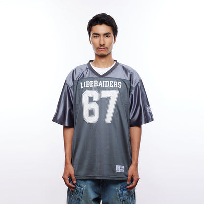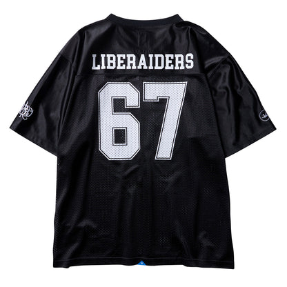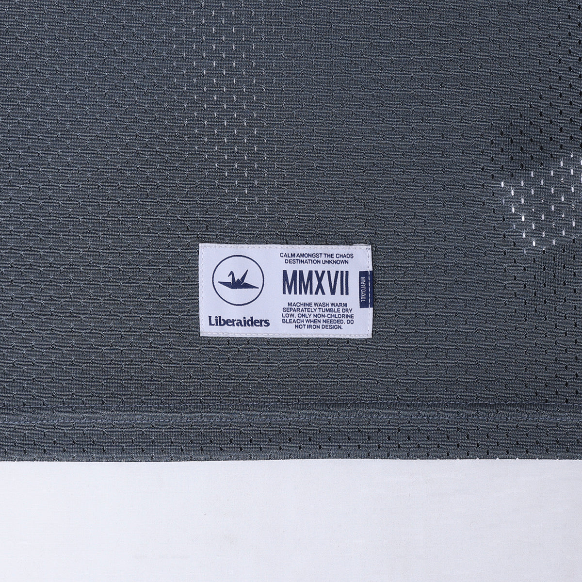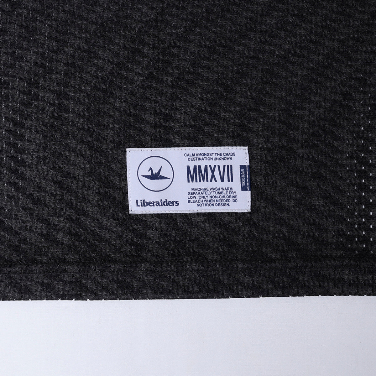 メッシュ生地とシャンタン生地を組み合わせたFOOTBALL TEE。前後にLiberaiders logoとナンバリングをプリント。両袖に折り鶴とLBRDRSのロゴが刺繍で入ります。