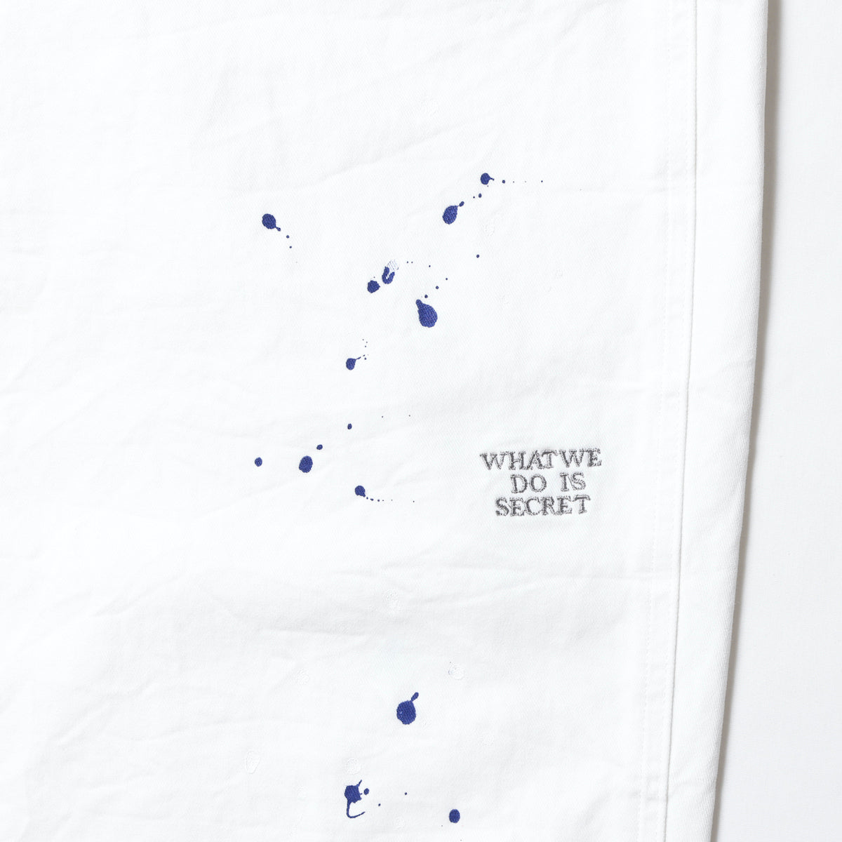 左腿にWHAT WE DO IS SECRETの同色刺繍が入ります。背面のスパナポケットには折り鶴同色刺繍が総柄で入ります。