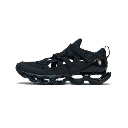 WAVE PROPHECY STRAPのアッパーデザインは、陸上のスプリントスパイクから想起させている。特徴的なアッパーのデザイン、パターンは、ミズノのスプリントスパイクのフィッティング理論に基づき、ポイントを締め上げ、ワンアクションでフィッティングをコントロールできるストラップ構造となっており、更にフィッティングを高めるアジャストテープを備えることで微調整が出来る設計となっている。