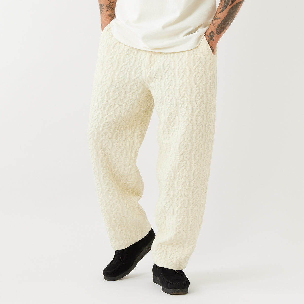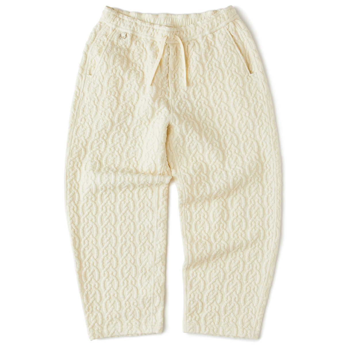 ケーブルニットをモチーフとした中綿カット素材を使用することで、暖かみのある仕上がりになったイージーパンツ。ルーズ過ぎないヒップボリュームできれいなストレートシルエットもさることながら、印象的な素材感によりボリュームが生まれ、いつもとは違ったカジュアルスタイルを演出してくれる。穿き心地の良さはもちろんのこと、Dリングを備えキーホルダーやカラビナを装着可能。バックのブランドネームも程よいアクセントに。【素材】表地/綿57% ポリエステル42% ポリウレタン1% 別布/ポリエステル65% 綿35%