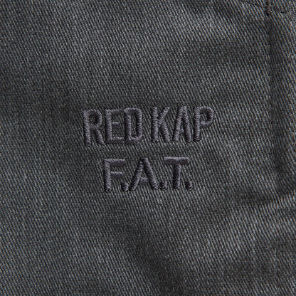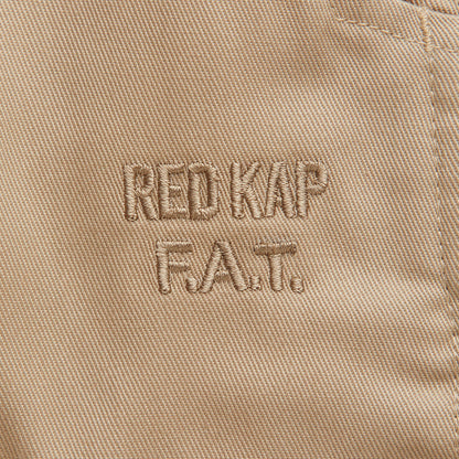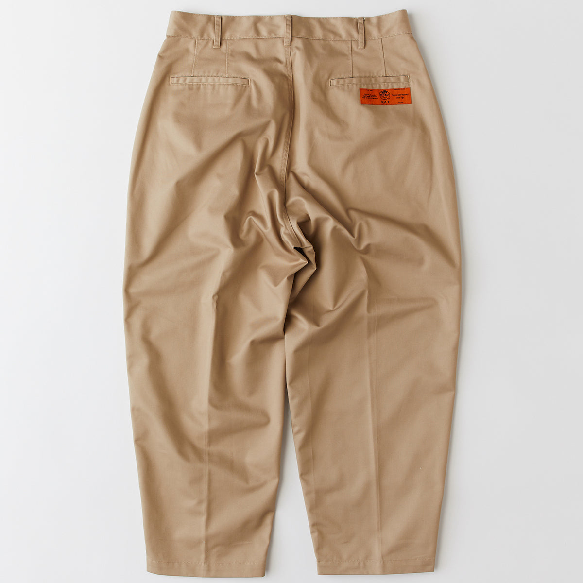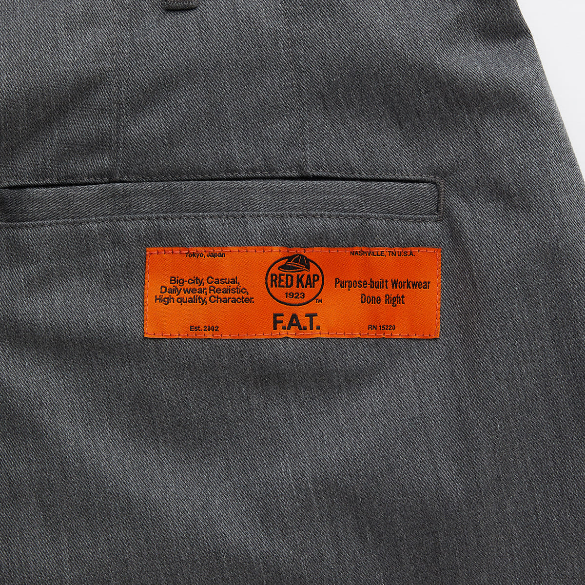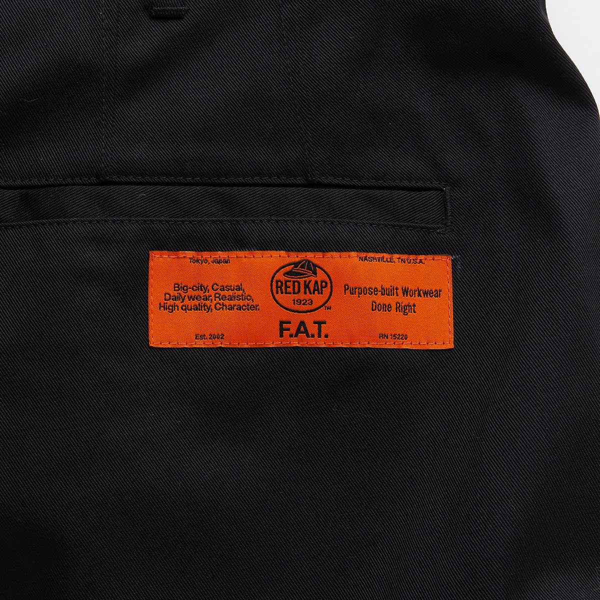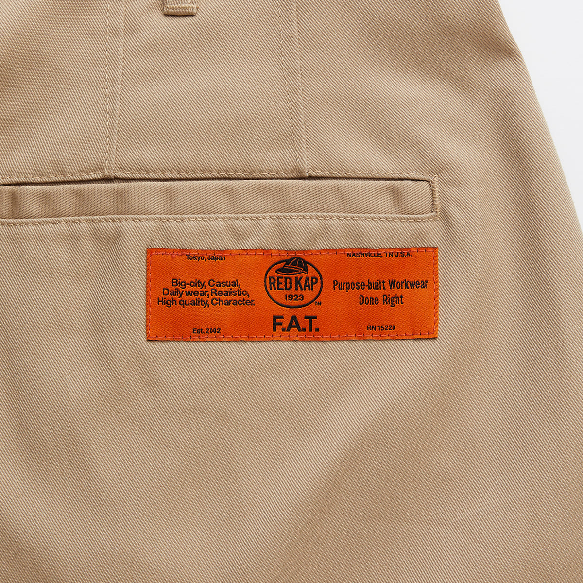 RED KAP×F.A.T.のコラボレーションによるワイドチノタイプパンツ。洗いのかかった柔らかなT/Cツイルを使用し、ヒップから膝にかけてボリュームを持たせたワイドテーパードに加え、ジャストレングスによる独特なシルエットが魅力。穿き心地の良さはもちろんのこと、右フロントのネームループにDリングを備えキーホルダーやカラビナを装着可能。ポケット下のロゴ刺繍、バックのネーム、ドローコード先端のロゴプリントなどこのコラボのためだけのデザインディテールも魅力。Quality