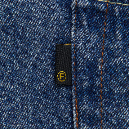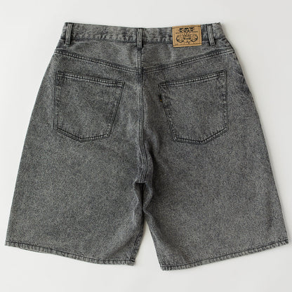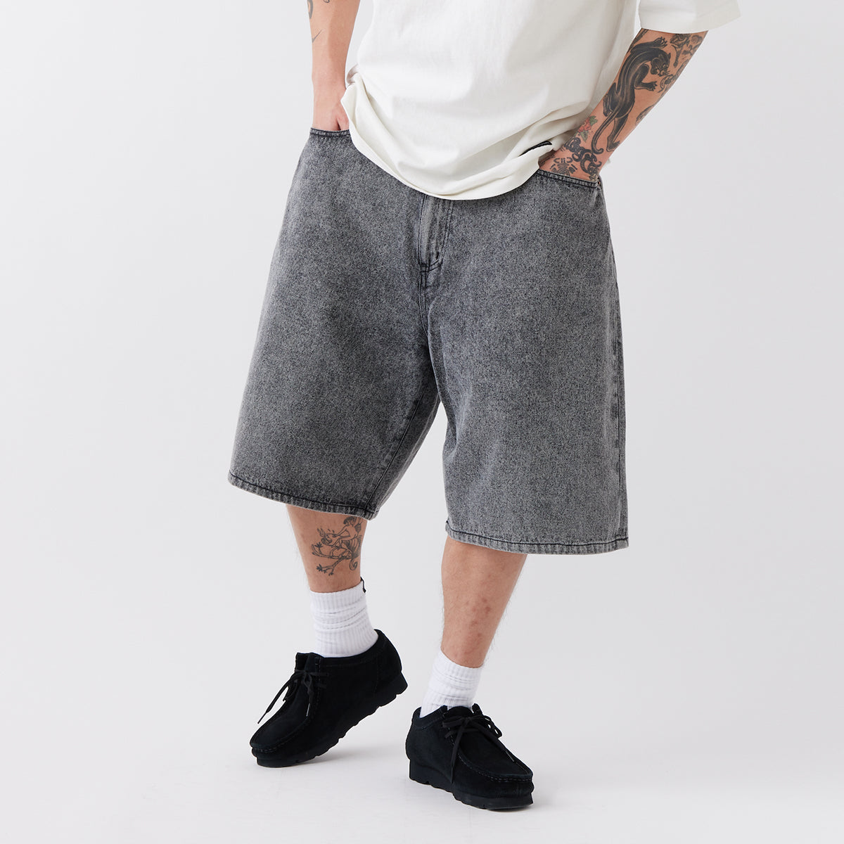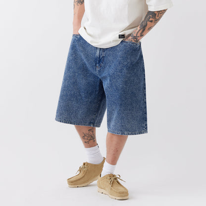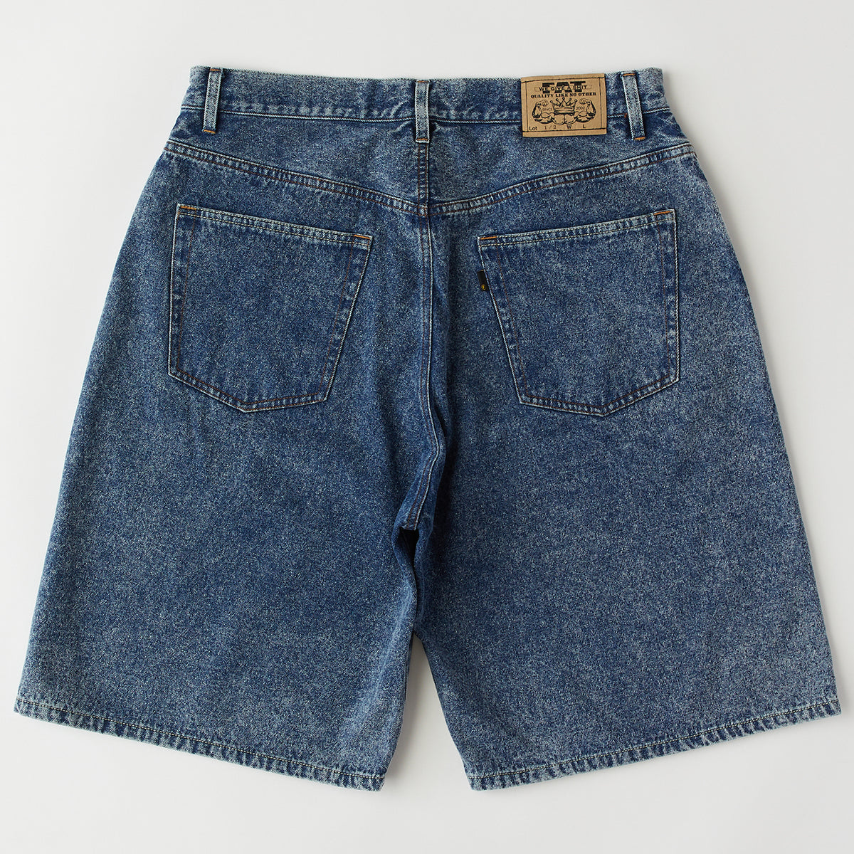 ケミカルウォッシュを施した独特なムラのある加工感が印象的なデニムバギーショーツ。"247"をベースとしながらも、レングスを膝下までとり裾幅を広げた絶妙なワイドシルエットが魅力。