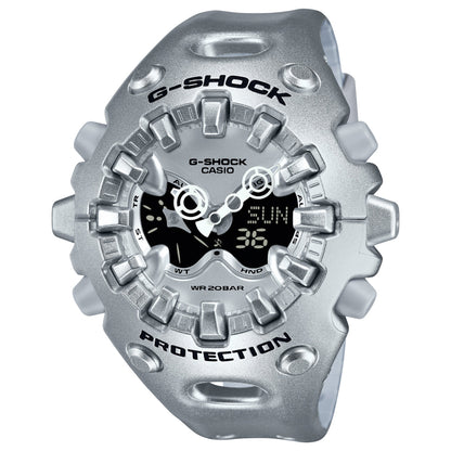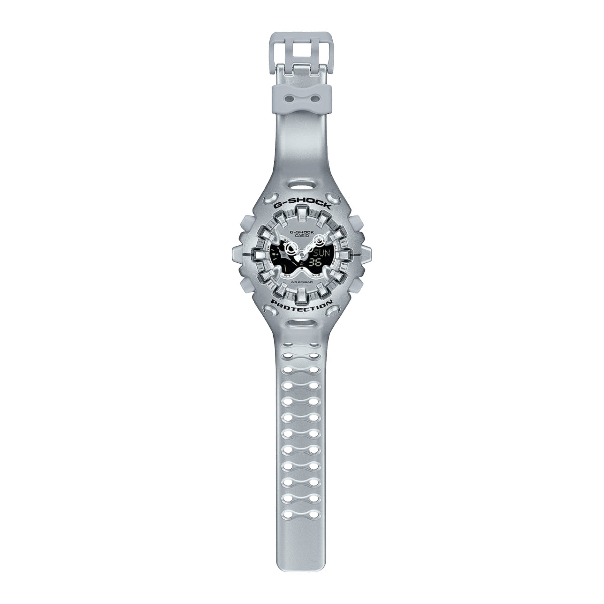 モジュールを保護するセンターケースを、ベゼル・バンド一体構造の外装パーツでカバー。大型の立体インデックスをガラス上面に配置することで、衝撃を緩和するバンパーの役割を持たせました。G-SHOCK独自の耐衝撃性能をキープしながら、ユニークかつ力強い外装デザインを実現しています。
