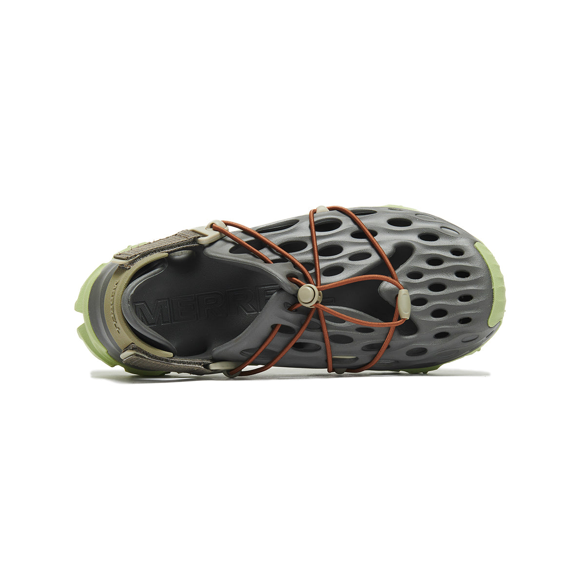 "HYDRO MOC AT CAGE" は、優れた反発弾性を発揮するEVAフォームケージアッパーにより構成され、その素材には10%の藻類バイオマスから生成されたサステナブルな素材 ”BLOOM(R)パフォーマンスフォーム”を採用しています。また、踵部を的確にホールドするリアスリングとトグルレースクロージャーにより、着脱のし易さと優れたフィット感、デザインにもアクセントをもたらしました。