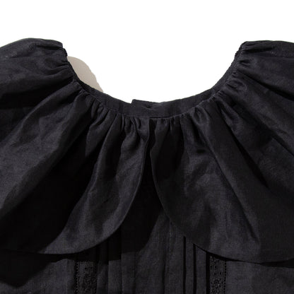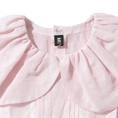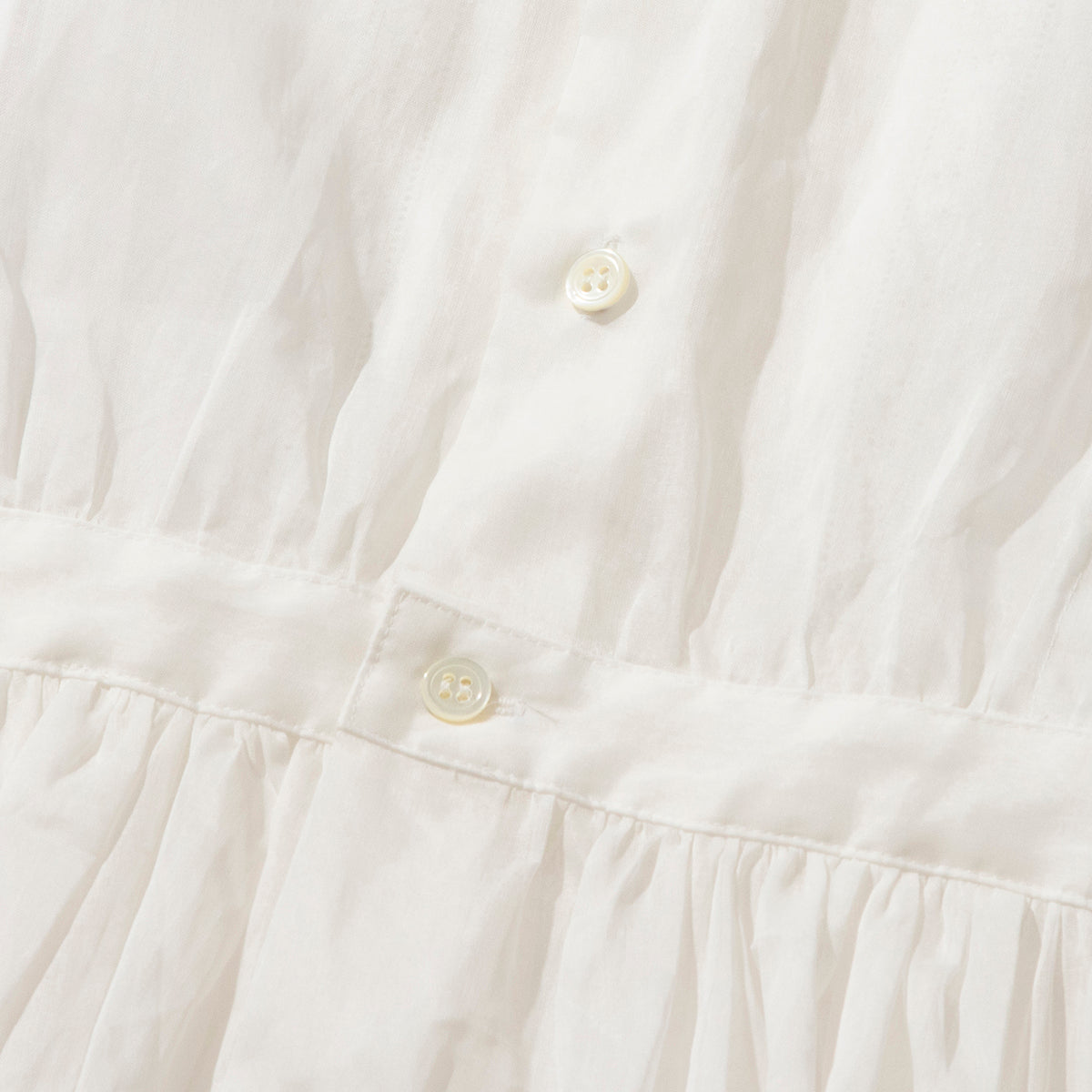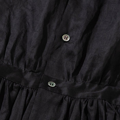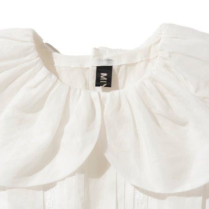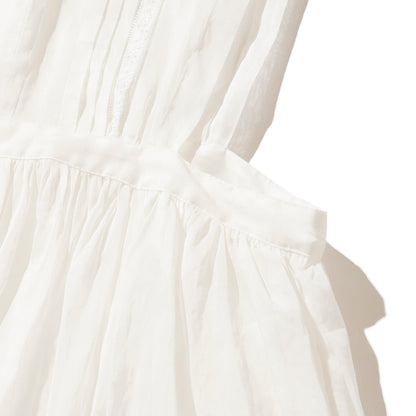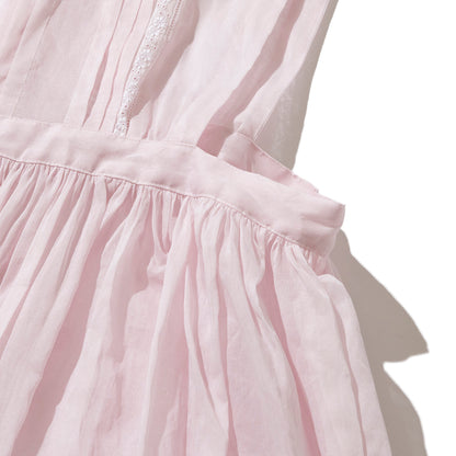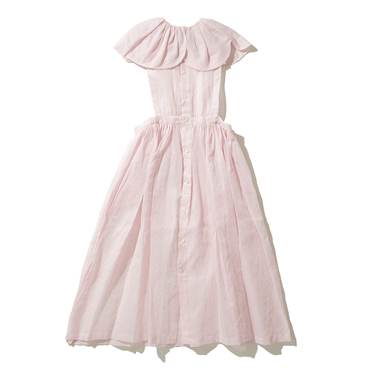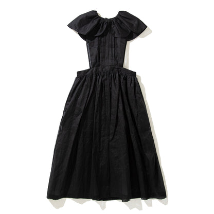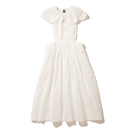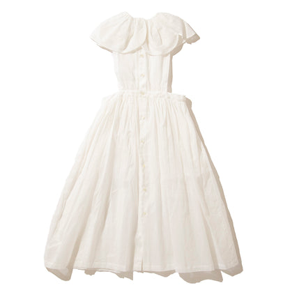 大きなスカラップ衿の付いたエプロン型のドレスです。素材は綿100%のオーガンジーで、加工と生地染めにより独特な色、ハリとシワ感が出ています。【素材】綿100%