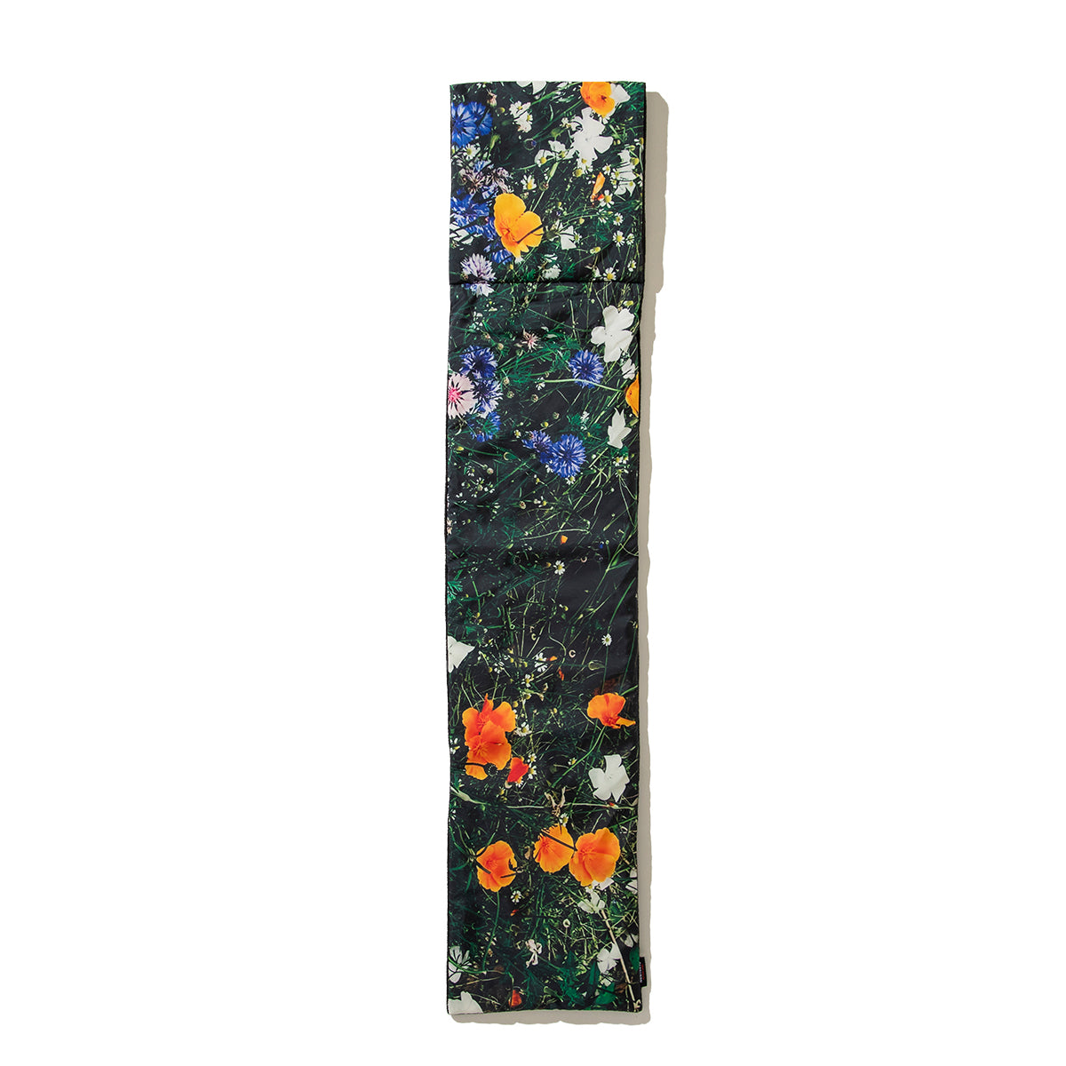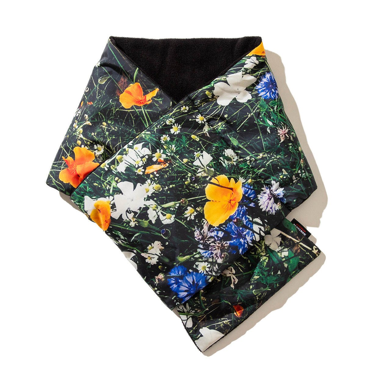 中綿がふんだんに入ったプリントマフラー。高密度の軽いタフタを用いているので、着心地は勿論のこと、裏面はフリースで保温性も抜群です。
