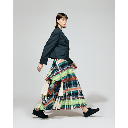 転写フォトプリントが施されたティアードスカート。風景をインクジェットプリントで施し製品で加工しているので、折シワやアタリが1 点1点異なる味わいを出しています。