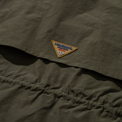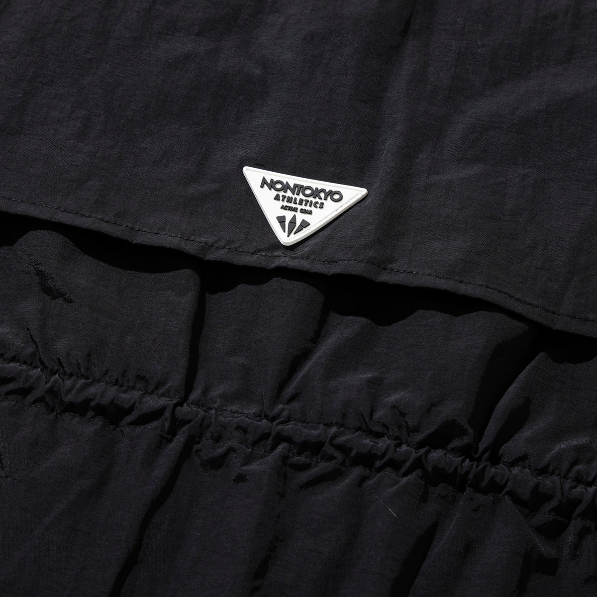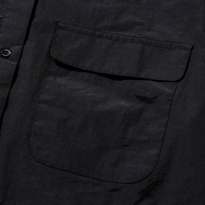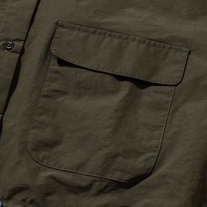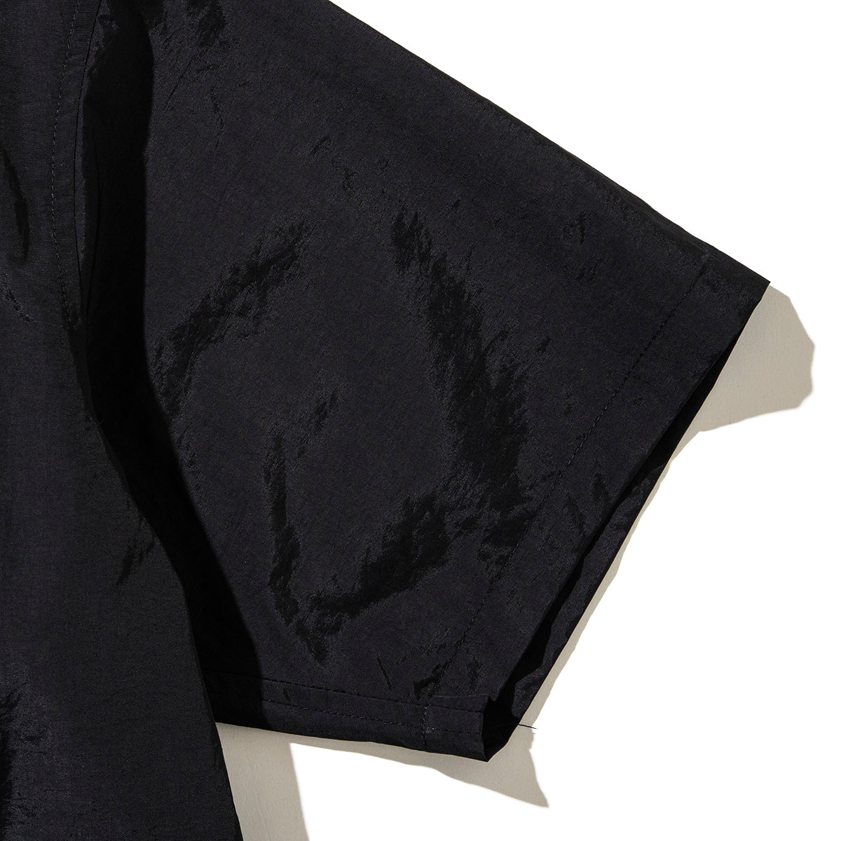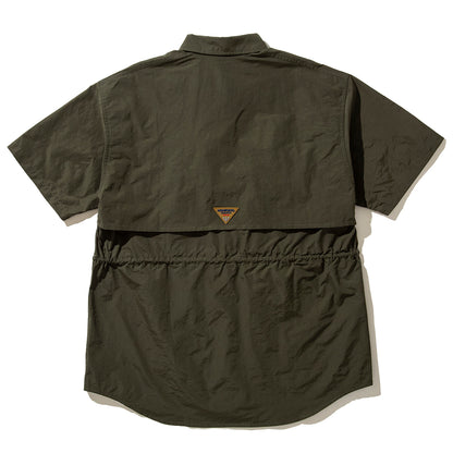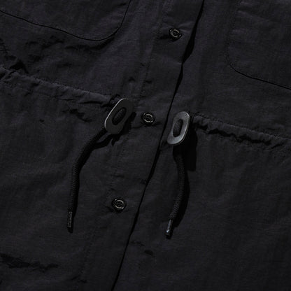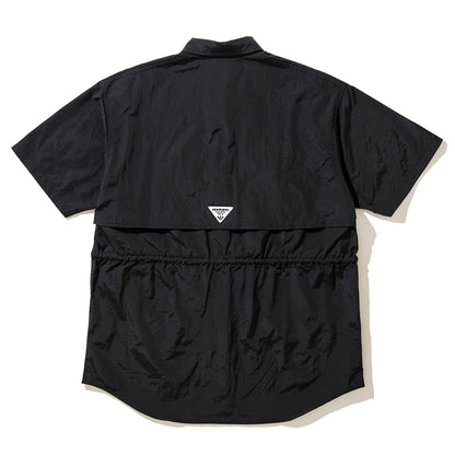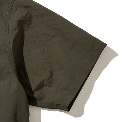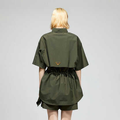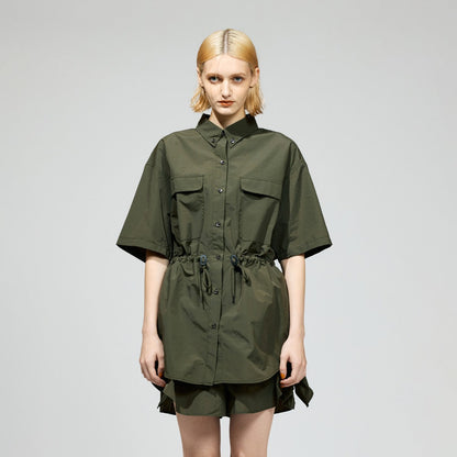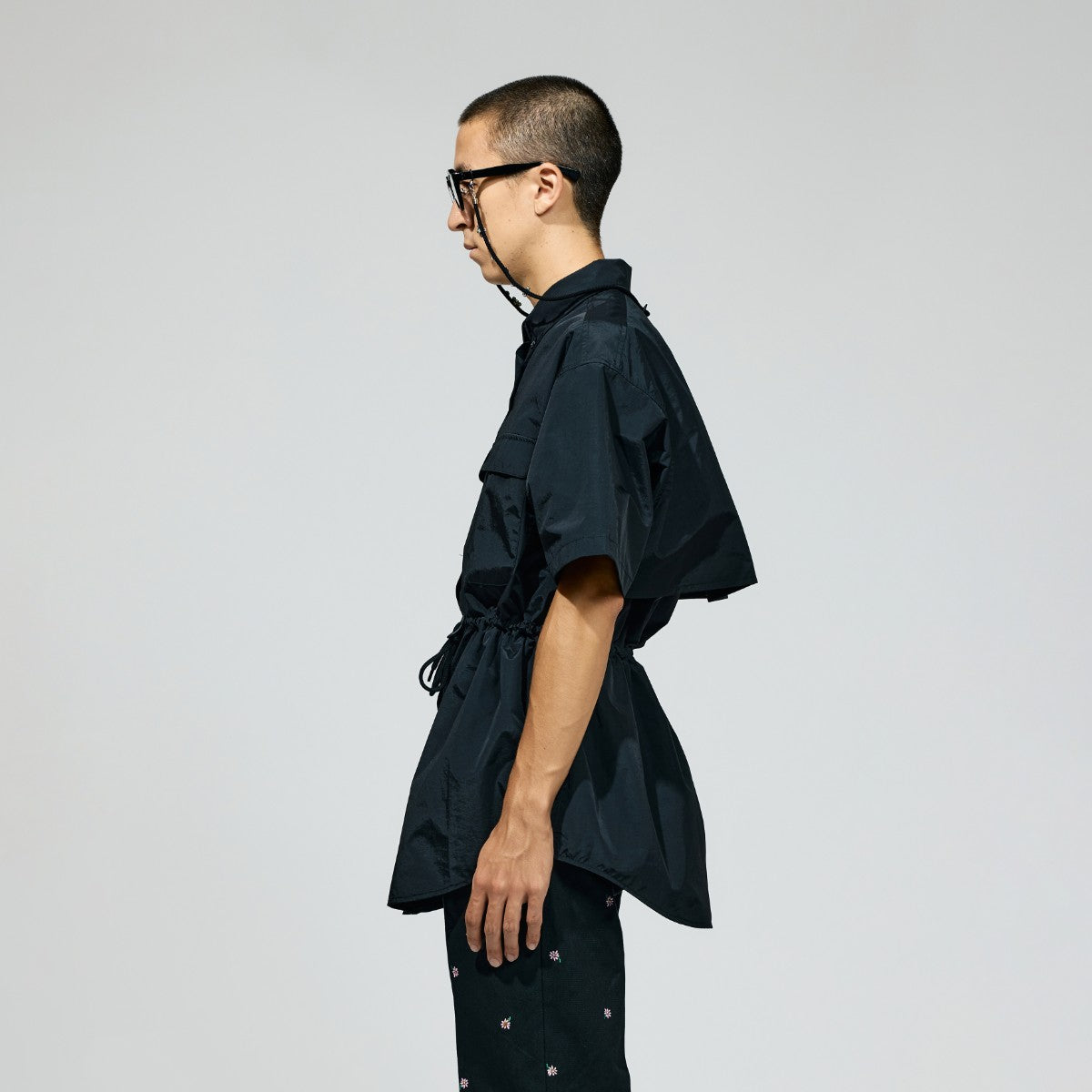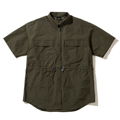 ナイロン素材の半袖のカーゴシャツ。ウエストに通ったコードを絞ることでシルエットが大きく変わり、着方の変化を楽しめます。