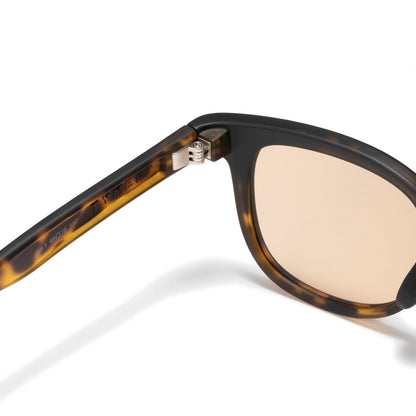 ボストンとウェリントンを掛け合わせた絶妙なシェイプはシンプルながらもモダンな仕上がりに。絶妙なサイズ感により性別やスタイルを問わないモデルです。フレームはトートイス(べっ甲)、レンズは眩しさを抑えつつ目元を彩るライトブラウン。-