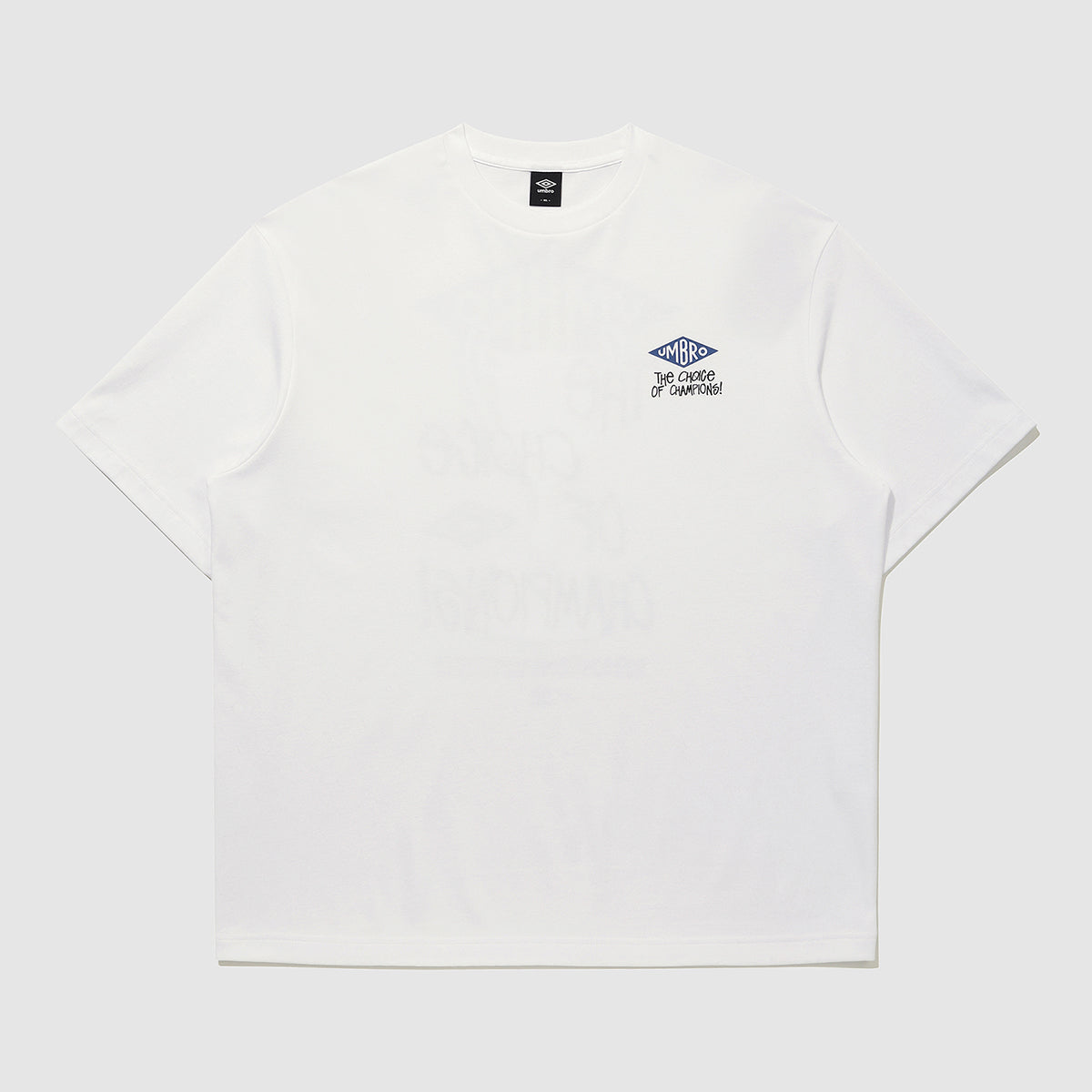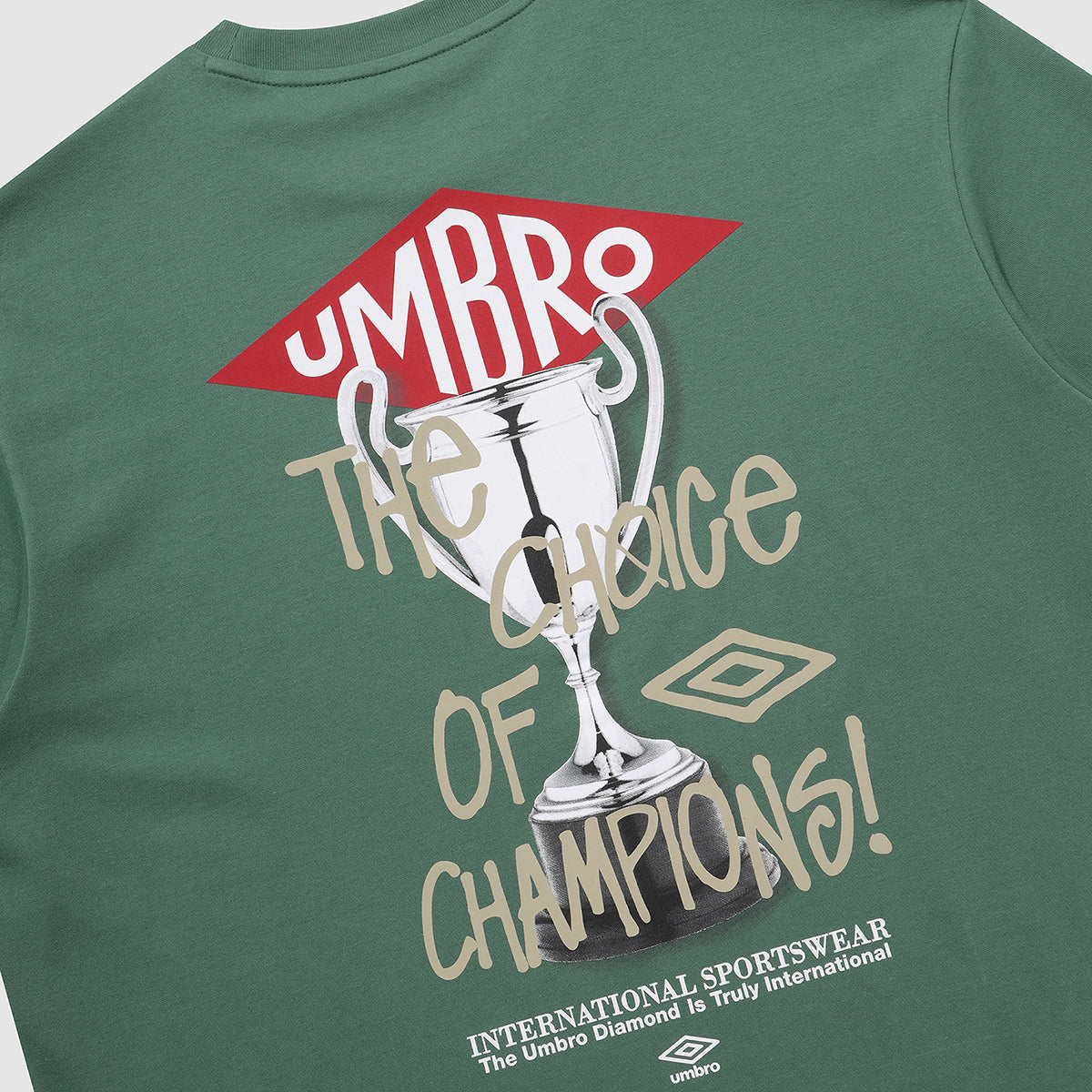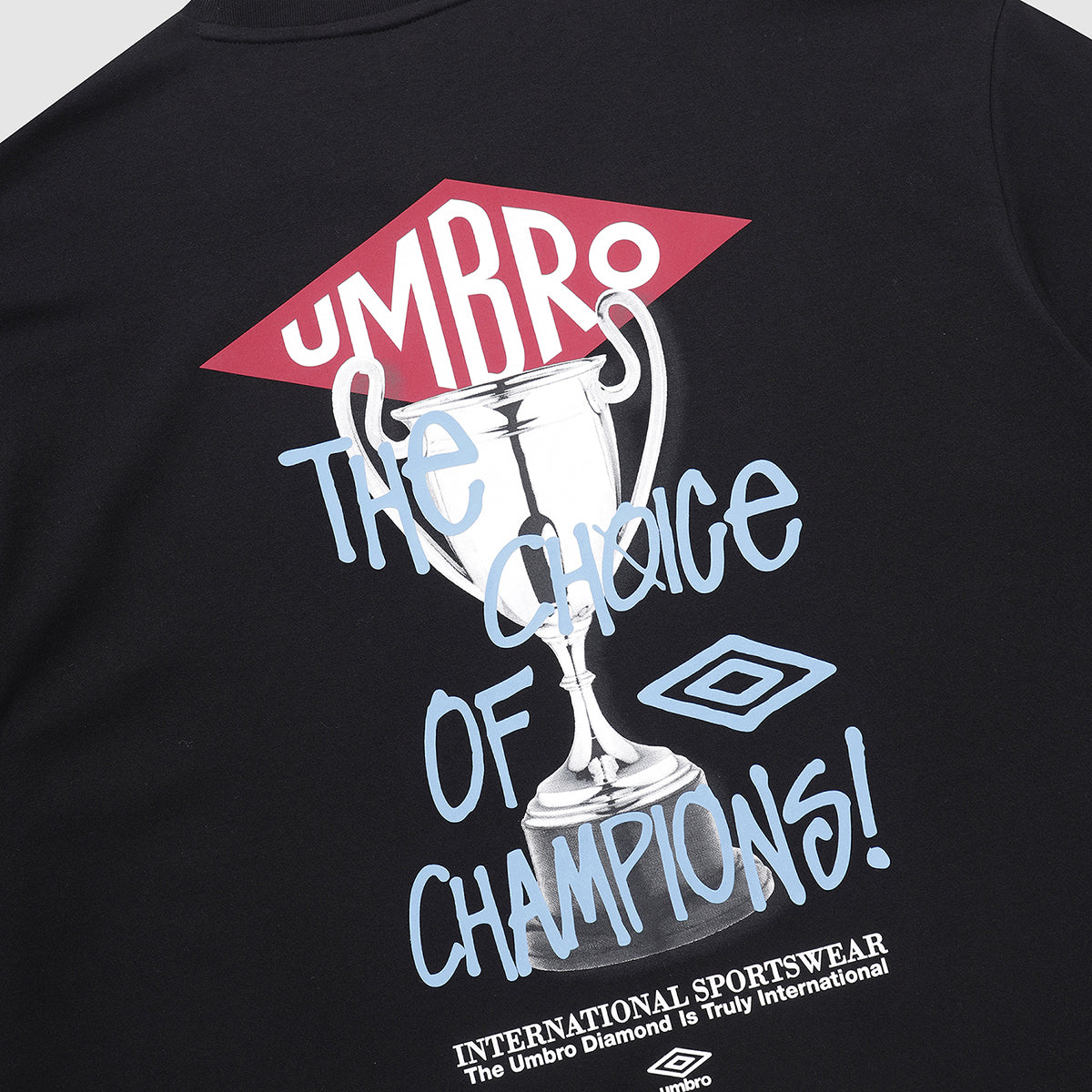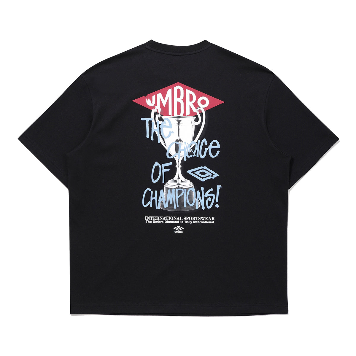 アンブロアーカイブの「トロフィー」からインスピレーションを得たグラフィック半袖Tシャツ。オーバーフィットシルエットと背面のアートワーク配置でストリートなムードを演出。